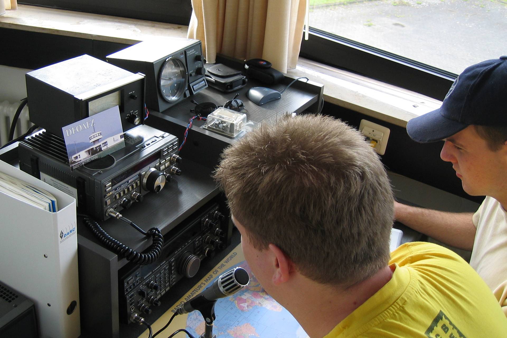 Dos radioaficionados comunicandose mediante una estacion de operaciones.